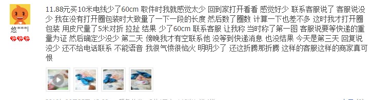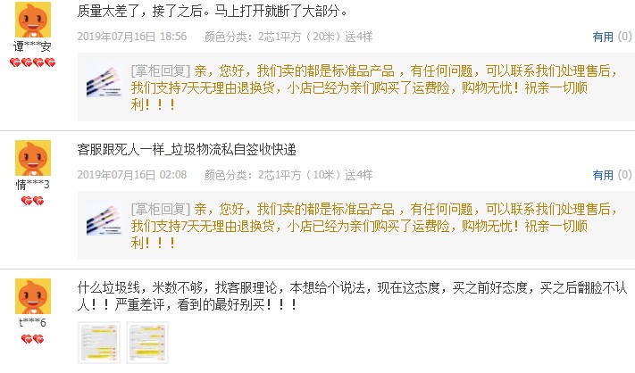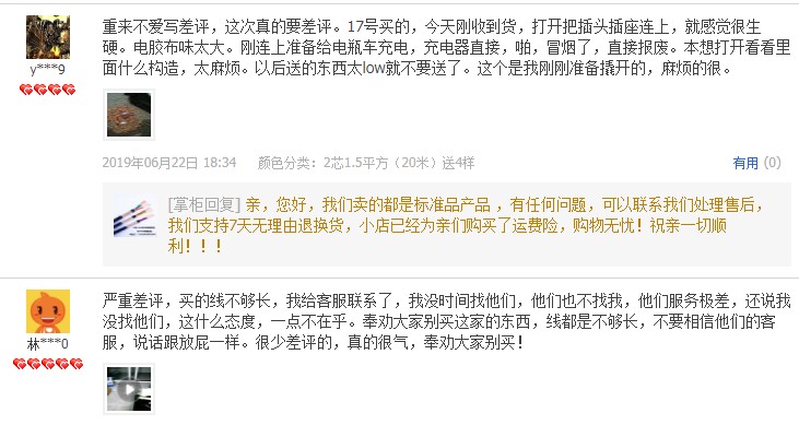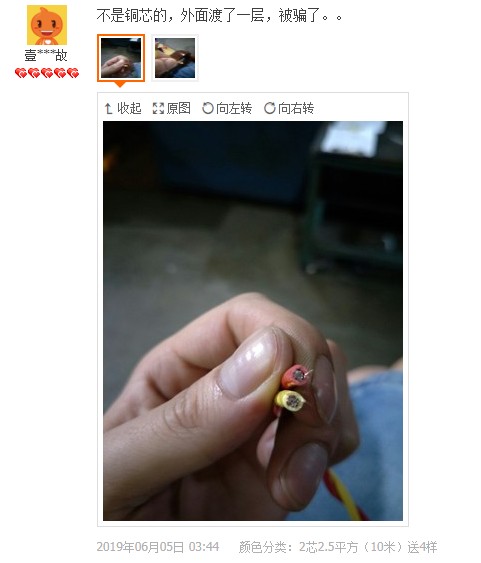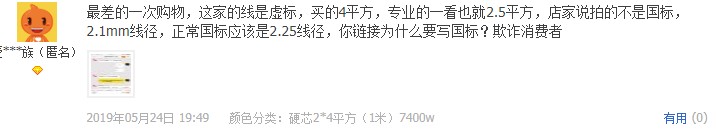 評(píng)價(jià)截圖有很多,我這邊就不一 一發(fā)出來了,總結(jié)幾個(gè)特征,冒充國標(biāo),截面積虛標(biāo),米數(shù)不足,導(dǎo)體斷線,鋁鍍銅,這個(gè)就是低價(jià)的本質(zhì),如果你是買回家當(dāng)擺設(shè)并且不怕刺鼻味的,盡可能多買點(diǎn),其余用途作為晾衣繩都怕斷。