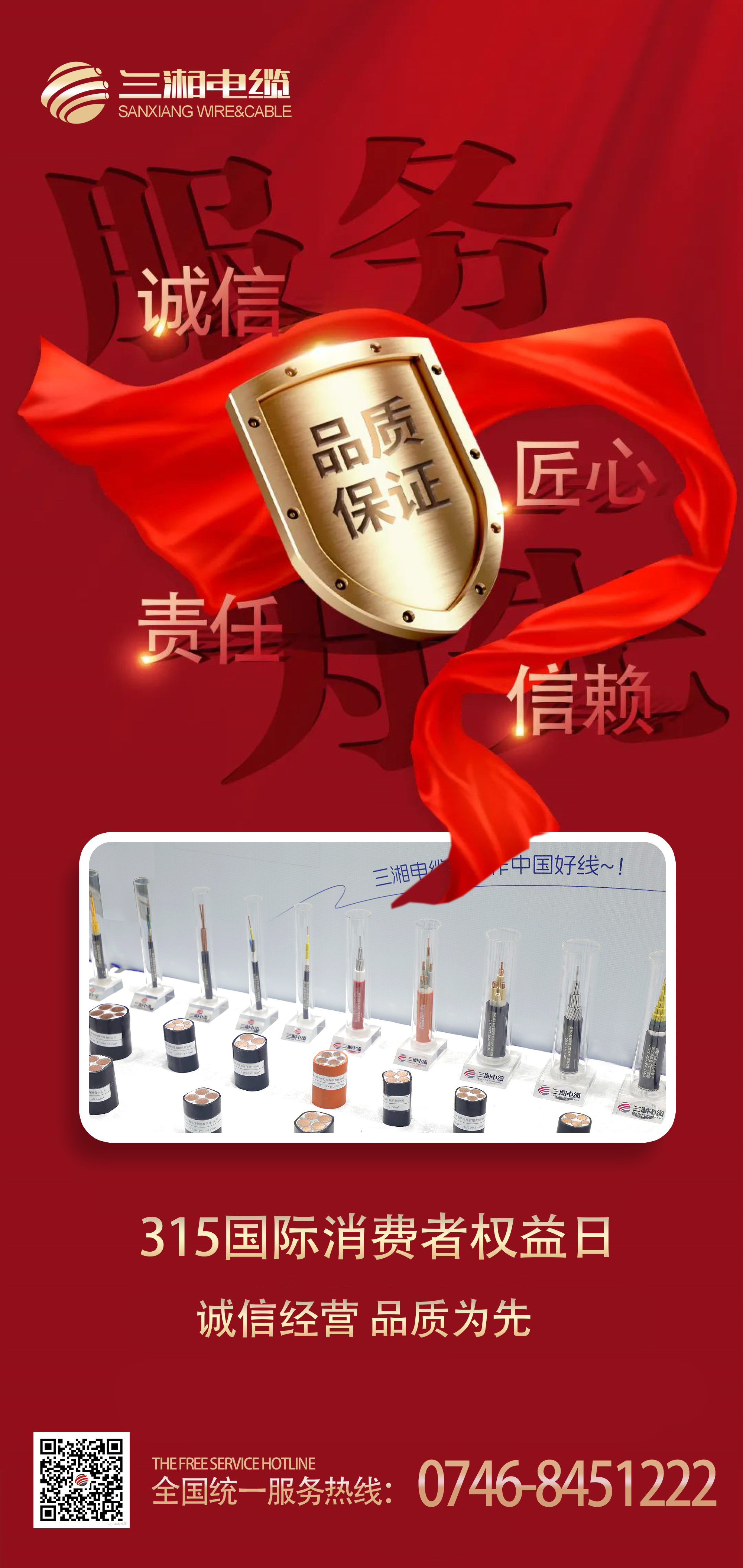 3·15消費者權(quán)益日到了,誠信一直是三湘電纜自始至終堅守的使命與責任,作為高品質(zhì)電線電纜制造商,三湘電纜從1999年創(chuàng)立至今,25年來踐行誠信的態(tài)度始終如一,堅持以高質(zhì)量的產(chǎn)品品質(zhì)保障消費者對線纜的需求,以“服務(wù) 品質(zhì) 誠信 共贏”的核心發(fā)展理念贏得客戶的滿意與認可!
